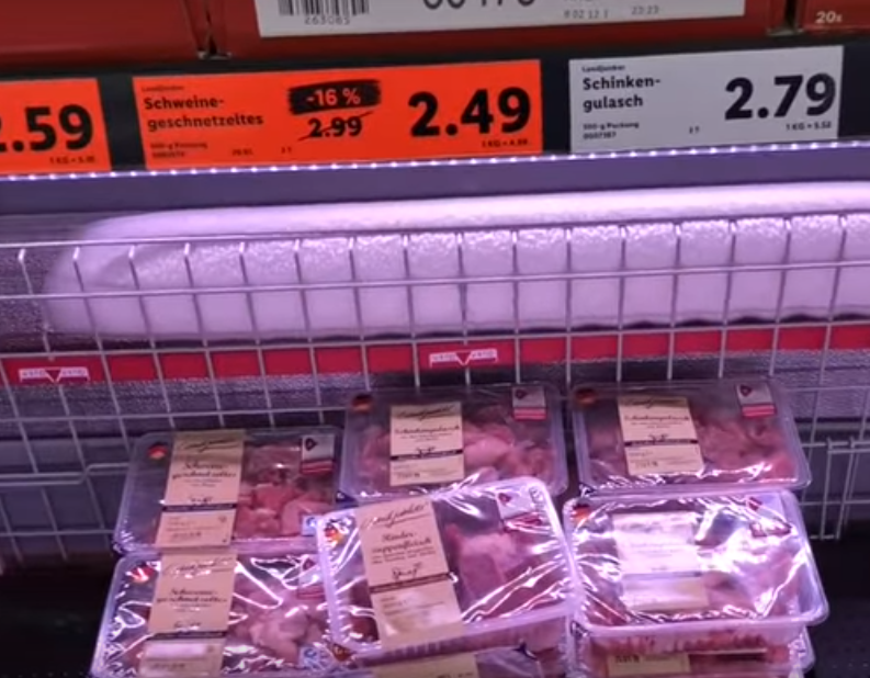 Повальное открытие продуктовой сети магазинов СВЕТОФОР просто поглотило наши города.Спроси сейчас у любого,где можно дешево купить продукты и тебе практически без паузы ответят,что в СВЕТОФОРЕ,а не где либо.А вот мой друг из Германии мне сказал,что у них тоже есть такие магазины,как наш и называются они просто.Первый из известных это Lidl,а второй по популярности это ALDI.И я попросил своего друга прислать мне несколько фото,что бы понять сколько в этих магазинах стоят обычные продукты,как у нас.Кто хочет может переводить цены с евро на рубли. Шея свинины по скидке 2,49 цента за 1 кг. Бананы 1,09 за 1 кг. Мандарины 1,19 центов. Обычный репчатый лук по цене 1,69 центов. Помидоры на ветке стоят 2,29 центов за 1 кг. Кефир 1 % цена за литр 0,69 центов. Бутылка молока 0,9 литра стоит 0,69 центов. Сметана вес упаковки 0,5 кг.Цена 0,39 центов. За десяток яиц просят 0,25 сентов. Стоимость хлеба везде разная,примерно 1,29 центов за булку. Известная шампунь Шаума,400 грамм стоит по акции 1,65 це