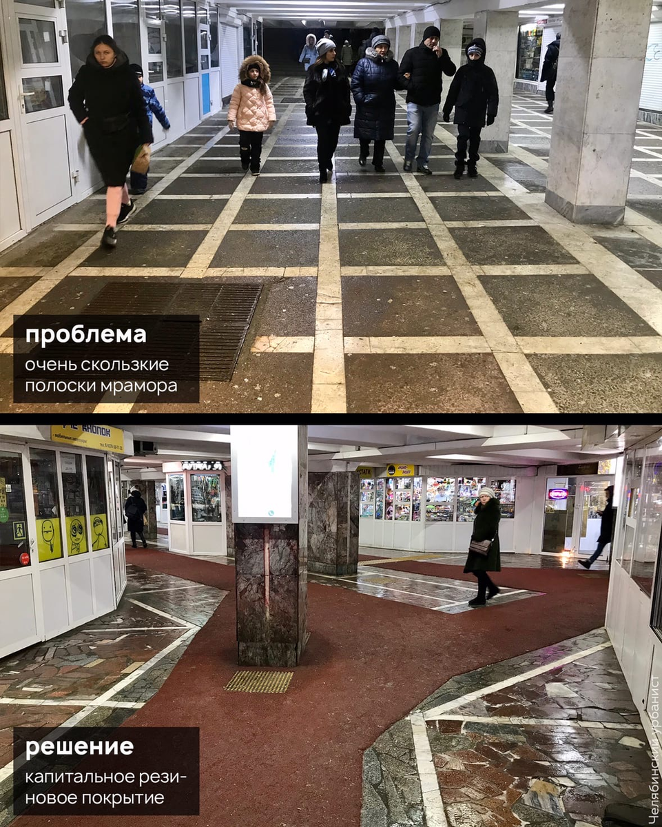 Обнаружил решение проблемы коварного скользкого пола советских подземных переходов. В Челябинске пешеходы, которые умудрились не упасть при спуске в переход, имеют шанс упасть на ровном полу, наступив на «белую полосу». Об этом почти не говорят, но проблема актуальна. В Казани придумали достаточно убедительное и постоянное решение из бесшовного резинового покрытия. Бери и копируй. (копировать на время, конечно, потому что подземные переходы должны в итоге исчезнуть, чтобы улучшить жизнь горожан)