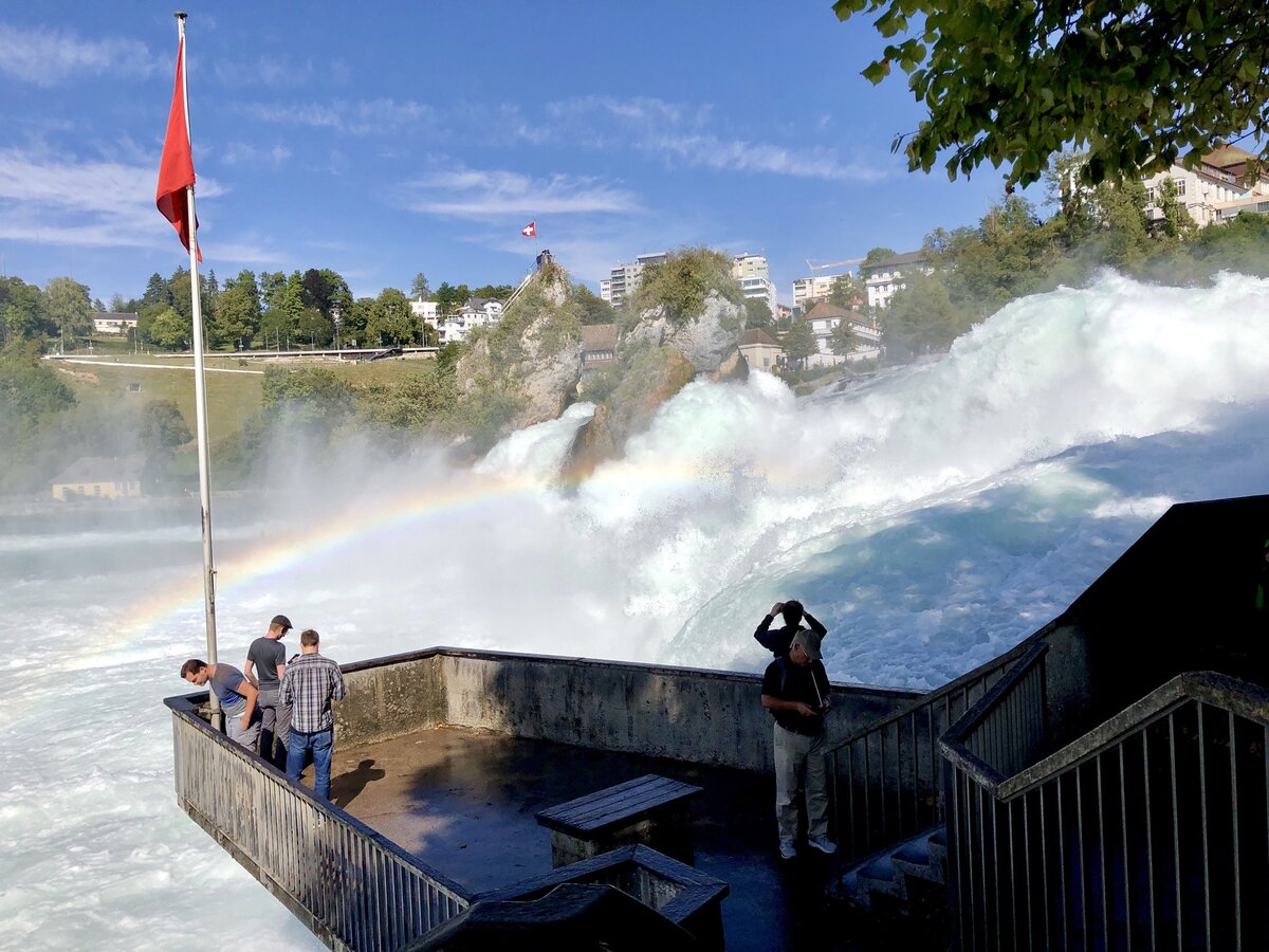 Если вы будете на севере Швейцарии, то обязательно рекомендую к просмотру Рейнский водопад (Rheinfall). Который считается самым большим в Европе по объему падающей воды вниз, вдобавок водопад разделяет две страны Швейцарию и Германию. Смотреть водопад лучше со швейцарской стороны, так как отсюда можно наблюдать весь жизненный цикл водопада. Вдобавок именно здесь чувствуется вся мощь падения нескольких тонн воды с большой высоты. Настроение подымет бесплатная парковка, а вот вход в водопадный комплекс платный - 5 франков После прохода всех зон контроля за большими стенами забора открывается панорама на водопад и немецкие земли Со смотровой площадки можно спуститься вниз и встать под водопад, чтобы от первого лица прочувствовать и увидеть всю мощь падения воды. Спуститься можно пешком по асфальтированной дороге или на лифте. Лучше выбрать путь по тропе, так как на разной высоте будут специально оборудованные фототочки За 8 франков можно на кораблике доехать до скалы по центру водопада,