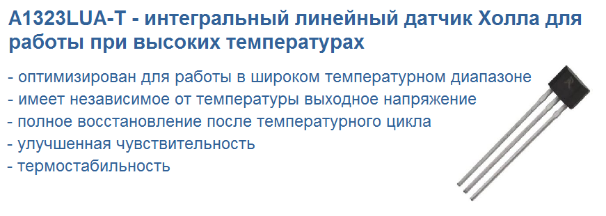 A1323LUA-T (ALLEGRO) – интегральный датчик Холла, выходное напряжение которого линейно пропорционально приложенному магнитному полю. Максимальное выходное напряжение составляет 50% от напряжения питания. Магнитная чувствительность датчика равна 2,5 мВ/Гн. Датчики этого семейства идеально подходят для использования в жестких условиях окружающей среды, в автомобильной промышленности, а также в качестве линейных датчиков положения. Схема датчика реализована на одном кристалле BiCMOS, и включает в себя элемент Холла, улучшенную схему температурной компенсации, а также усилитель с высокой чувствительностью, большим коэффициентом усиления и низкоомным выходным каскадом. Особенности датчика A1323LUA-T: Allegro MicroSystems, LLC является 100% дочерней компанией Sanken North America, Inc, разработчиком и производителем интегральных микросхем. Компания в основном работает в автомобильной промышленности и, помимо двигателей, производит магнитные датчики на основе датчиков Холла. Компания базиру
