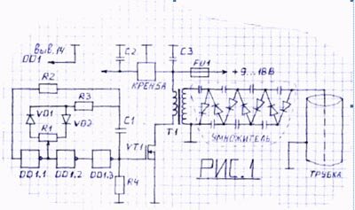 Повышающий трансформатор строчник от ЧБ телевизора, найдете там же. Удаляете все первичные обмотки и наматываете 9 витков тем же проводом от удаленных обмоток. Лучше предварительно намотать несколько витков изоленты. Для питания микросхемы можно использовать КРЕНку на 9В, но она сильно греется. Транзистор обязательно установите на радиатор не менее 5х5 см с ребрами охлаждения. Сами понимаете, не домашние условия под капотом. Умножитель напряжения собираете навесным монтажем, можно скрепить клеем между собой конденсаторы, а потом подпаять диоды. Обязательно залейте эпоксидным компаундом в походящей форме. На крайний случай купите компаунд фирмы Анлес «Эпокси Классик», это эпоксидка со свойствами замазки. Обработайте ею толстым слоем все выводы конденсаторов и диодов. Располагается схема в одном корпусе. У меня умножитель расположен в 4 см от радиатора транзистора, нет проблем. Корпус строчного трансформатора подсоедините к массе, на нем скапливается электростатическое электричество которое периодически пробивает на первичную обмотку через прокладку. Неполадок конечно не происходит, но лучше перестраховаться. И обязательно после сборки схемы испытайте ее на холостую без трубки. При этом на умножителе напряжение будет порядка 60000В. В темноте корпус умножителя не должен светиться. Потом это перерастет в пробой. Приведенная схема слаба для трубки и при подключении её напряжение не будет подниматься выше 30000-35000В. Вместо самодельного умножителя можно применить умножитель от телевизора УН-9/27. Там вывод плюс. Казалось бы никакой разницы. Но двигатель с разной полярностью умножителя меняет свой характер. Если умножитель с отрицательным выводом, то двигатель эластичнее в работе, отличная низовая и верховая тяга, угол зажигания увеличится на 1-3 градуса. Если использовать готовый от телевизора, то плохая низовая тяга с детонацией (но лучше чем вообще без ионизатора), верховая отличная, УОЗ наоборот придется уменьшать на пару градусов, двигатель работает шумно. И еще недостаток – трубка является электрофильтром, задерживает самую мелкую пыль которая оседает на внутренней стенке. Постепенно она становится электроизолятором и эффект уменьшается. Придется протирать стенки каждые 300 км. На рисунке 2 схема включения промышленного УН9/27. Для повышения напряжения и эффекта можно добавить самодельный умножитель как показано, можно и без него. Не используйте мегаомные резисторы на выводе высокого напряжения с умножителя как это делается для безопасности в домашних ионизаторах. В трубке будет сильное падение напряжения и потеря эффекта, лучше позаботиться об изоляции.