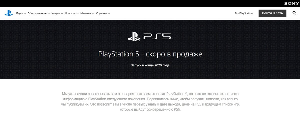 Компания Sony оказалась тихушей и спокойно без лишнего шума опубликовала тизер-сайт или проще говоря страничку, посвященную выходу Sony Playstation 5. Теперь уже точно можно сказать, что консоль 5го поколения выйдет в конце года, а так же нам предлагают подписаться на новостную рассылку, в которой нам обещают рассказать первые подробности касательно технических характеристик, цены и игр стартовой линейки. Ранее в январе 2020 Sony продемонстрировала логотип в рамках выставки CES2020, первые подробности касательно новой консоли должны появиться уже в феврале месяце. Инсайдерские слухи о том, что консоль должна выйти в мае 2020 не подтвердились. Оставайтесь с нами! Дальше будет больше!