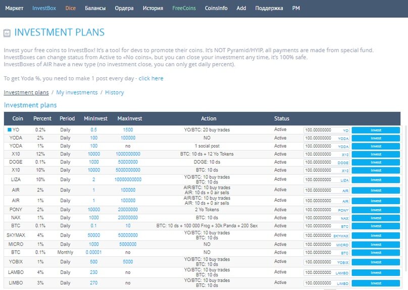 На бирже представлено много инвестпозиций, для большинства требуется выполнить определенные действия в течении суток с открытия инвеста для получения процента. Ознакомится со всеми можно на вкладке InvestBox У многих возникает вопросы к администриции биржи и куча негодования когда им не начисляют проценты, разберем подробней как не пролететь с выплатами У каждого инвеста, есть свои условия -колонка Action, их нужно обязательно выполнять в любое время между начислением процентов (отсчет 24 часа) Разберем инвестплан токена Yo: YO начисляется 0.2% в день, минимальная ставка 0.5, максимум 1500 YO, для выполнения условия YO/BTC 20 buy trades — (перевожу на русский ;) ) нужно сделать 20 «баев» (купить 20 раз) по минимально ставке 0.0001 BTC Самая частая ошибка: совершили 20 покупок в нужной паре, а инвест не начислен, нужно проверять выполнен ли полный ордер на 0.0001, если ордер выполнен частично, данный «бай» не засчитывается системой. Проверить можно на вкладке история По аирдропу YODA