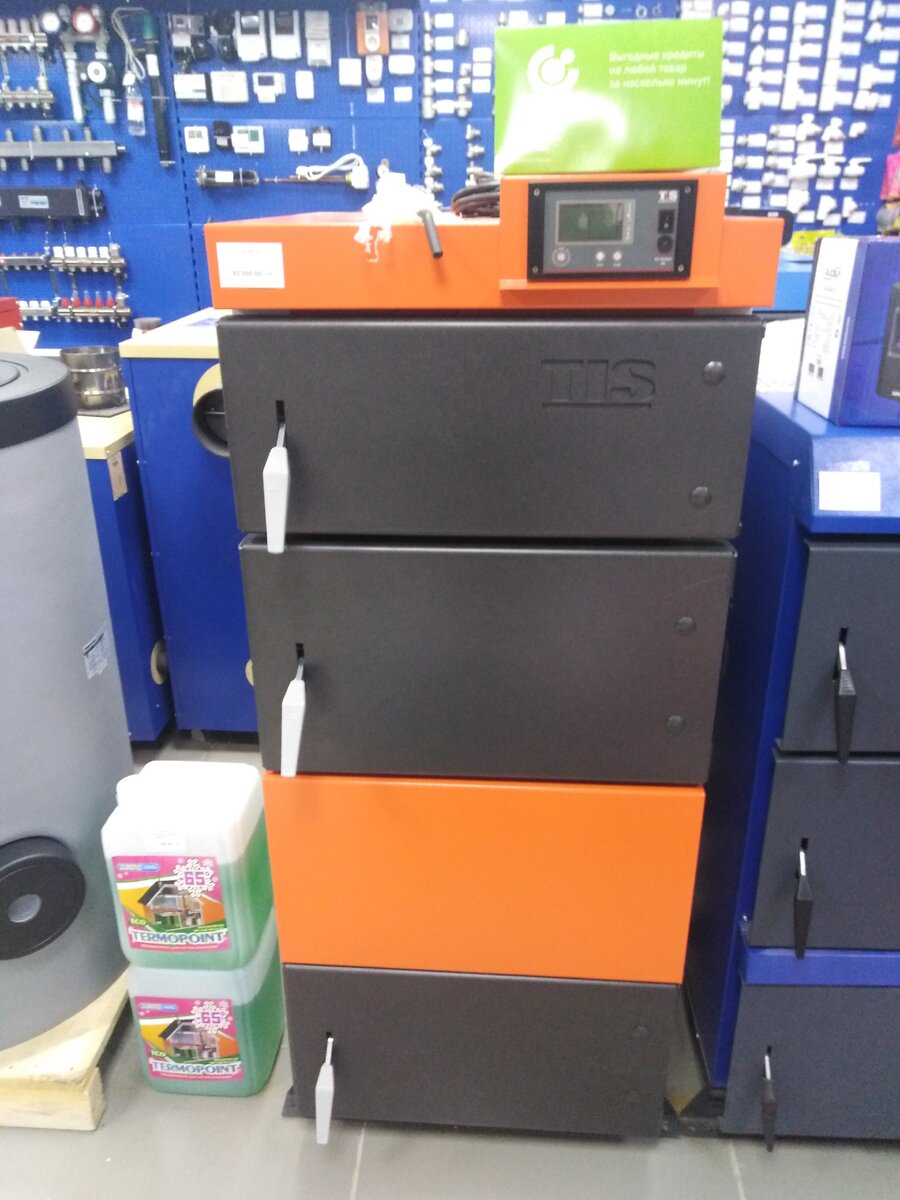 Доброго времени суток дорогие друзья. Сегодня в нашем обзоре твердотопливный котел TIS UNI 15. Линейка котлов UNI насчитывает 9 единиц ( 15,25,35,45,55,65,75,85,95 ). От 80 м2 до 950 м2 отопления. Но давайте про UNI 15. Котел производства республики Беларусь. Работает на площадях от 80 до 200 м2. Сталь - 5 мм. Дополнительный теплообменник, для снятия температуры с дымовых газов ( на выходе, порядка 130-150 градусов цельсия ). Это помогает увеличить КПД котла и продлевает срок службы дымохода. Объем топки 91 литр, диаметр дымохода 159 мм ( мы обычно переводим на сэндвич 150/210 ). Работает на 3-х видах топлива: дрова,брикеты,уголь. Габаритные размеры Ш*В*Г 59*62*142. Масса котла 326 кг. ( требуется фундамент или усиление конструкции полов. ) В комплекте: кочерга, совок,ершик для чистки. Котел оснащен автоматикой TIS TRONIC 83 ( по функционалу подробно можно ознакомится в инструкции ). Если коротко, автоматика управляет вентилятором ( подачей кислорода в топку котла ), насосом системы о
