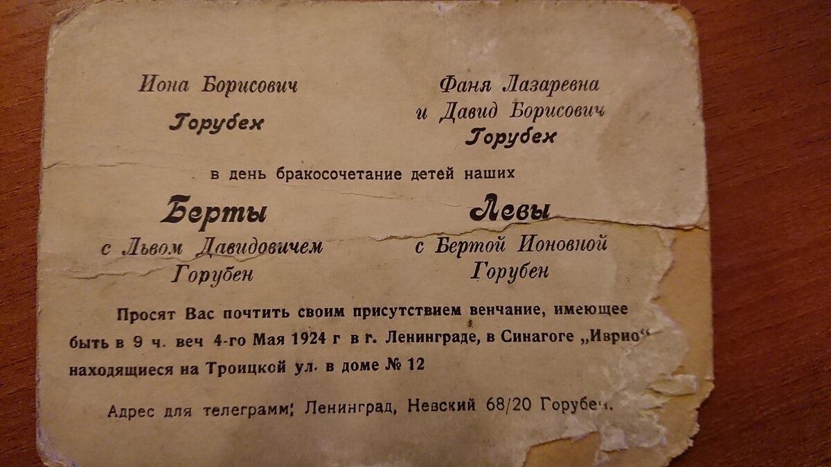Эту карточку с приглашением на бракосочетание Берты и Льва Горубенов, которое должно было состояться в 1924 году в ленинградской синагоге «Иврио», принесла в нашу редакцию Тамара Крисятецкая. Она нашла ее, перебирая семейный архив, но никаких подробностей не знала. Кто эти люди? Почему у жениха и невесты одинаковая фамилия? Мы сделали публикацию, попросив отозваться тех, кто мог что-то об этом знать. Откликнулась Ирина Ашкенази. Ее муж - внук тех самых молодоженов, венчавшихся в синагоге «Иврио». Ирина рассказала об истории той свадьбы и предоставила фотографии из семейного архива. Свадьба кузенов Тамара Крисятецкая была абсолютно права, предположив, что карточка осталась в семье от бабушки. В 1924 году Анна Ильинична Левкович была распространителем билетов в театре Комедии. Там же работала и Берта Ионовна Горубен. Очевидно, что новобрачная пригласила коллегу и приятельницу на торжество, вручив то самое приглашение. Интрига с одинаковыми фамилиями семей жениха и невесты объяснилась п