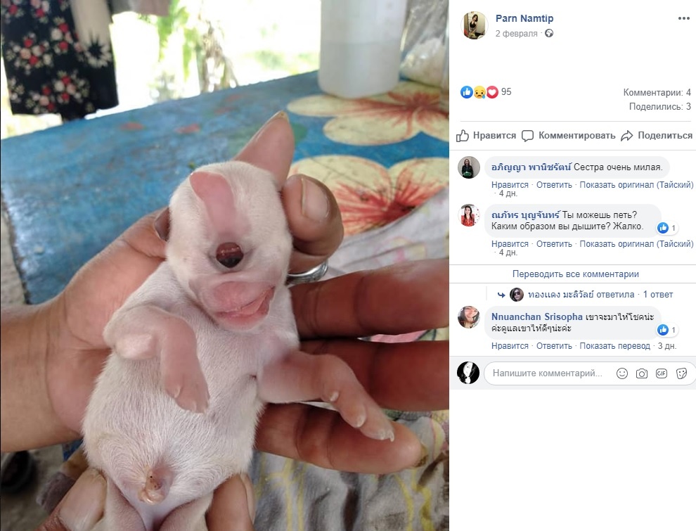 Щенок с редкой генетической мутацией появился на свет в тайской семье 2 февраля этого года. При циклопии оба глазные яблока позвоночных животных сращиваются по центральной линии в одной глазнице. Обычно новорожденные с таким отклонением не живут более нескольких дней или даже часов. Несовместимой с жизнью особенностью является изменение в строении челюсти из-за которых малыш элементарно не может самостоятельно питаться. Хозяева сочли рождение особенного щенка добрым знаком и окружили его заботой. Из-за сходства с миньоном из мультфильма «Гадкий я» его нарекли Кевином. Питается Кевин из бутылочки, это и помогает ему выживать на протяжении уже нескольких дней, это дает надежду что малыш сможет развиваться и дальше. А вот видит ли его единственный глаз пока неизвестно. На становление нормального зрения у щенков требуется около двух месяцев. К слову, после публикации его фотографии в социальных сетях, выстроилась целая очередь из людей, желающих стать его владельцем. Многие приходят п