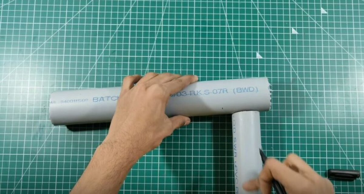 На трубе Ø50 мм отмеряем и отмечаем маркером длину двигателя. На трубе Ø40 мм отмеряем и отмечаем длину, удобную для того, чтоб держать в руке болгарку.