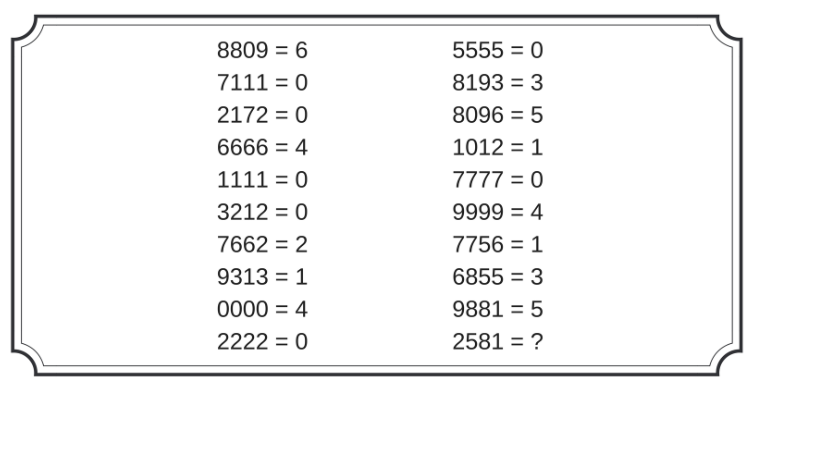 1. Что в огне не горит и в воде не тонет? 2. В квартире живут домашние животные: собаки и кошки. Из всех животных только одно не является собакой, при этом все питомцы, кроме одного, — кошки. Сколько всего кошек и собак? 3. Какое слово начинается на три г, а заканчивается на три я? 4. Посмотрите внимательно на картинку. Необходимо понять закономерность и вписать правильный ответ вместо знака вопроса. 5. Перед вами ряд слов: «сельдь», «кит», «акула», «тунец», «треска». Какое слово выпадает из этого ряда? 6. У врача три пары перчаток, а заболевших — четверо. Можно ли осмотреть всех без риска заразить себя и кого-то из пациентов? 7. Вы едете на машине вперёд со скоростью 100 км/ч. В багажнике автомобиля установлена пушка, которая стреляет назад мячом со скоростью 100 км/ч. Что произойдёт с мячом? 8. Перед вами игральные кости. Сумма точек на верхних гранях всех костей — 37. Какова сумма точек на всех нижних гранях костей? 9. Американский шпион стоял возле дверей секретно