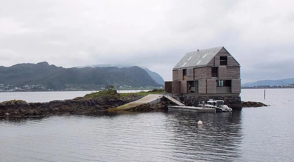 Мой старший братец Архитектор возглавляющий одноименное бюро,построил здание на маленьком острове Сильдегарнсхольмен в Норвегии.Дом находиться на месте старого склада ,разрушенного в 1992 году.В этом суровом месте часто непогода,сильные шторма.Климат очень сложный,что не дает мне покою вопрос долго ли простоит эта