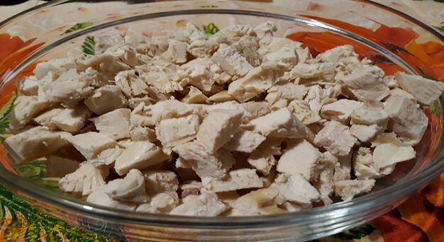 Дочка берет куриное филе(лоток), отваривает до полуготовности. Режет на квадратики. Куриную грудку можно отварить заранее, а вечером приходишь с работы, достать мясо из холодильника. Нарезаете на кусочки и все остальное по рецепту. Вкус только, что приготовленного блюда. Всего несколько минут и ваш ужин готов. Пока режет мясо, поставила кастрюлю с водой на плиту, чтобы приготовить рис. Рис можно брать любой, у нас в этом рецепте “Жасмин”. Берет примерно 1 /3 маленького пакета. Засыпает рис в кастрюлю с водой в соотношение 1 : 2. Довести до кипения и убавить огонь. Варить на медленном огне 12-15 минут, пока рис не впитает в себя воду.