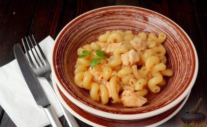 Этот рецепт макарон с курицей - просто уникальный. За полчаса, используя только один сотейник или кастрюлю, без особых усилий вы сможете приготовить очень вкусный и сытный обед или ужин для всей семьи. Продукты (на 4 порции) Макароны - 400 г Филе куриное - 350 г Лук репчатый - 150 г Чеснок - 4-5 зубков Паста томатная - 2 ст. ложки Базилик сушеный - 2 ч. ложки Масло растительное - 2-3 ст. ложки Соль - по вкусу Вода - 500-600 мл Пошаговое приготовление : Закройте сотейник крышкой, доведите воду до кипения, уменьшите огонь и тушите макароны с курицей на самом медленном огне до готовности макарон, примерно 10-12 минут. Сочные, вкусные макароны с курицей на обед или ужин - это успех! Приятного аппетита!
