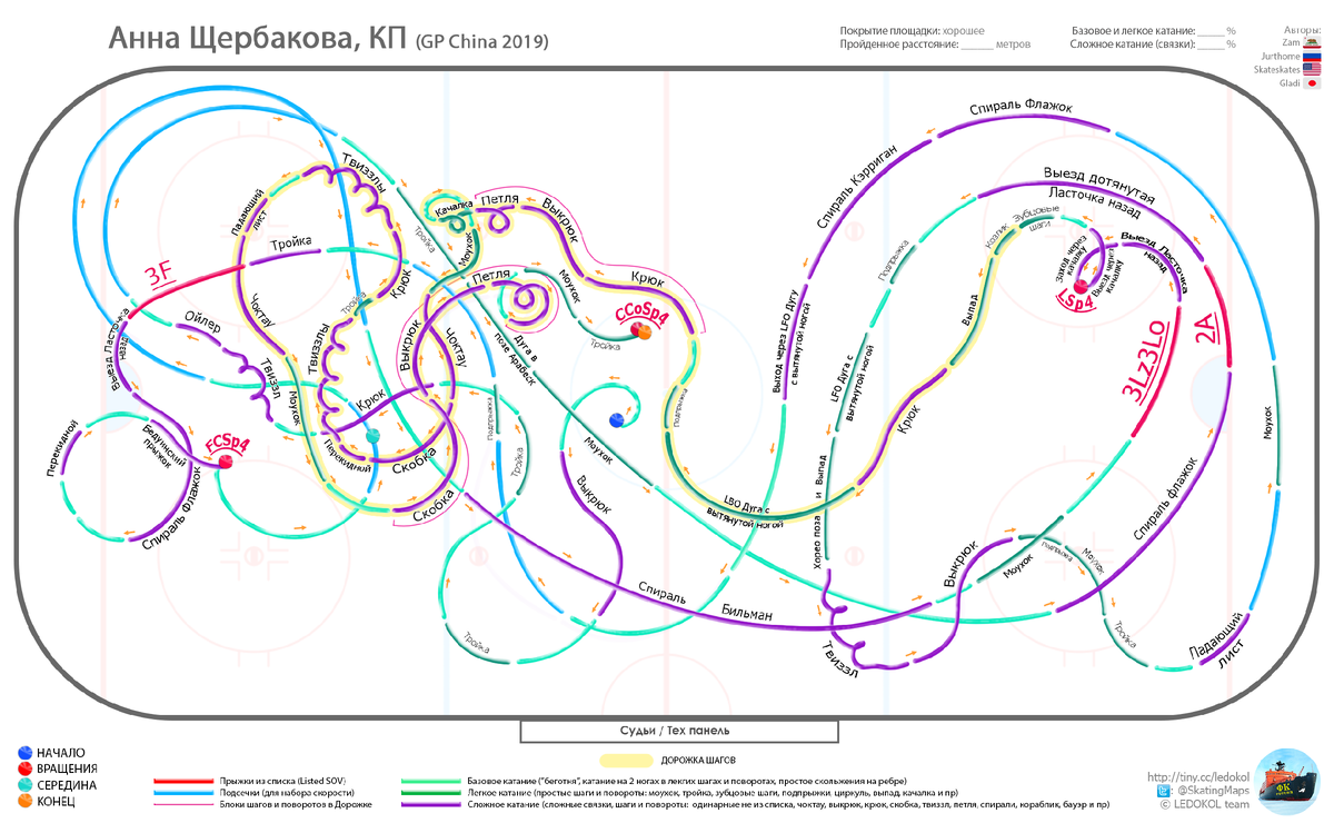 Всем привет! Мы сейчас очень торопимся, чтобы успеть опубликовать все карты для взрослых финалисток ФК. Все также не хватает рук. Мы по прежнему приглашаем энтузиастов, специалистов по разбору программ и художников. К нам даже уже японские и китайские фанаты обращаются с предложениями помочь с переводом и очень сильно нас хвалят. Вы можете заметить еще легкие изменения в дизайне и вёрстке, надеемся, что вам по нраву эти улучшения. Итак мы публикуем разбор короткой программы Анны Щербаковой. Весьма мистическая и таинственная программа от юной и удивительной по своей музыкальности фигуристки. Очень красивый и интересный рисунок на льду оставляет Аня своими коньками. Постарались отметить все связки, которые можно засчитать (не все засчитали). Внимательно прочитайте легенду карты внизу. Кликайте на картинку для большого размера. Музыка: Авторы музыки: Reinhold Heil, Tom Tykwer, Johnny Klimek. Альбом: "Das Parfum" Мы уже опубликовали ранее много карт коротких программ в том числе и таки