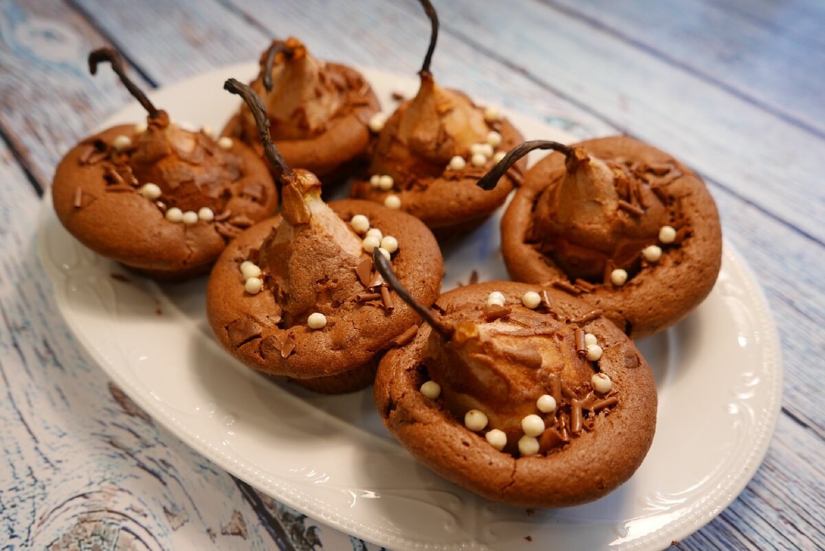 Предлагаю вашему вниманию потрясающе яркий и изысканный десерт! Шоколад и груша в нем - гармоничные союзники, создающие незабываемый вкус и аромат, покоряющие сердца самых взыскательных гурманов-сладкоежек. Это настоящая шоколадная эйфория, поверьте👍 🍽 Пошаговый рецепт: 🍐 40 гр темного шоколада (70,5%) растапливаем на водяной бане. Даём остыть. 🍐 Отделяем желтки и белки 2 яиц. 100 гр размягченного сливочного масла взбиваем миксером с 50 гр сахара до пышной консистенции (3-5 минут). Далее вводим желтки и продолжаем взбивать ещё пару минут. Добавляем остывший шоколад и на медленной скорости смешиваем. Продолжая перемешивать, всыпаем 50 гр просеянной муки. Туда же ложкой аккуратно вводим 40 гр термостабильного шоколада. 🍐 Два белка взбиваем миксером до образования крепких пиков, вводим 25 гр сахара, и взбиваем ещё 3-5 минут. Взбитые белки частями вводим в шоколадное тесто. 🍐 Груши очищаем от кожуры и от сердцевины, оставляя хвостики (берите такие плоды по размеру, которые поместят