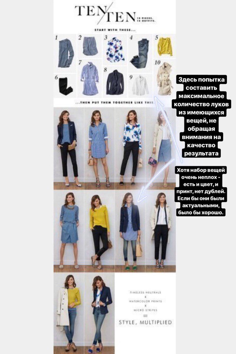 В этом случае в гардеробе в ряд висят 7 разных брюк и 3 юбки, а надеть их получается с одной-двумя футболками, да и то, не всегда. И кажется, что постоянно нечего носить.