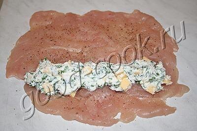 На край куриного пласта уложить творожную начинку. Завернуть так, чтобы начинка оказалась внутри.
