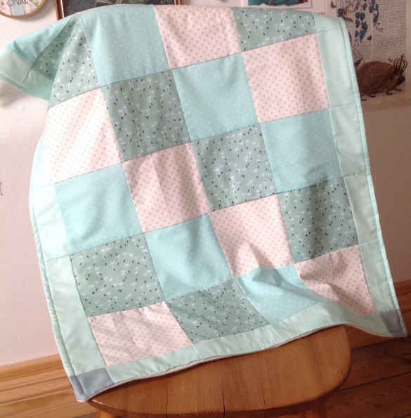 Я очень люблю шить детские одеяла. Потому что они шьются быстро (мне всегда нравится побыстрее увидеть результат). Это одеяло очень простое. Если вы умеете шить на машинке прямые строчки, вы сможете легко его сделать. Что вам понадобится? Я считаю, что лучшая ткань для одеял, это хлопок 100%, но вы можете использовать другую ткань. Ткани я не стираю, перед тем, как начать шить. Хотя многие советуют, из-за того что ткань может "сесть" при стирке. Цвета тоже на ваш выбор, я очень люблю такие постельные оттенки, особенно голубой цвет). Вам понадобится квадратный шаблон. Вы должны решить, какого размера он будет. Возможно вы захотите, чтобы квадраты были поменьше размером, тогда их понадобится больше. У меня были квадраты 12 на 12 см. Также нужно нарезать прямоугольники 12 на 5 см и 4 квадратика 5 на 5 см. Так же понадобится коврик для раскроя и раскройный нож, линейка, нитки, ножницы. Мне нравятся швейные нитки "Gutermann". Они отличного качества. Для нижнего слоя потребуется хлопок, и
