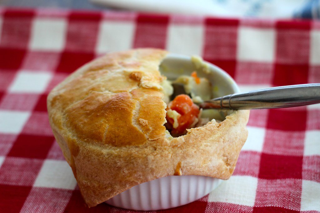 Я прекрасно понимаю, что возиться с тестом, начинкой и выпечкой мало кому хочется. Но после того, как вы один раз приготовите этот пирог из курицы, вам захочется еще и еще, так что вы не сможете остановиться :) На самом деле готовиться такой куриный пирог довольно просто и быстро, все что вам нужно для начинки - куриные грудки, приправленные розмарином и отваренные в бульоне. Итак, ингредиенты: ► 2 коржа для пирога. Конечно, можно использовать и домашнее тесто, но так ведь проще :) ► Столовая ложка оливкового масла (можно использовать растительное) ► 2 грудки, отваренные в бульоне ► 2 столовые ложки нарезанного свежего розмарина (можно использовать сухой) ► 2 столовые ложки свежей петрушки ► Соль и перец по вкусу ► 2/3 стакана куриного бульона ► 1/3 стакана масла ► 1 головка нарезанного чеснока ► 1/3 репчатого лука ► мука ► 2/3 стакана молока ► замороженные овощи ► фольга Шаг 1: Разогреть духовку до 220 градусов C.