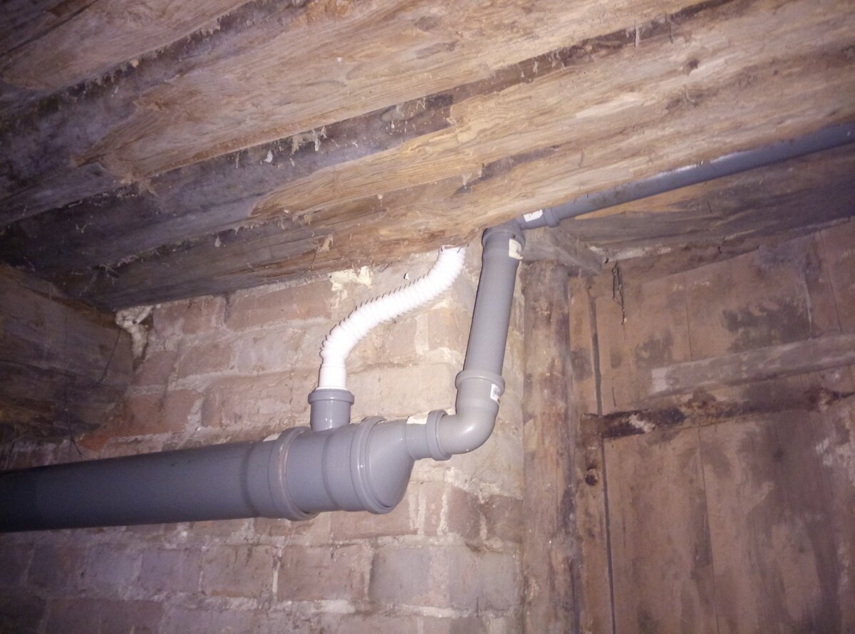 Мне удалось сделать пропил и высунуть гофру от душевой из дома в подпол. Осталось дело за монтажом канализационных труб. Диаметр специально выбрал максимальный. Это не город, большого протока воды нет и будет забиваться. Для крепежа взял в магазине стандартные крепежки пластиковые, прикрутил их на саморезы к стенам и вставил в них трубы.