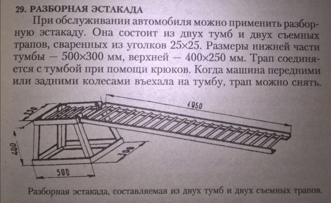Всем привет, автомобиль нуждается в регулярном осмотре и техническом обслуживании, начинающие автомобилисты чаще всего пользуется услугами СТО, а это в зависимости от модели авто, обходится в круглую сумму. Именно поэтому опытные водители предпочитают проводить техническое обслуживание и мелкий ремонт своего автомобиля самостоятельно. Это не только экономит средства, но и является отличным хобби и позволит вам самим контролировать все процессы обслуживания вашего авто. Произвести ремонт автомобиля своими руками не очень сложно, если иметь необходимое оборудование. Главной проблемой большинства водителей становится отсутствие смотровой ямы в гараже, которая позволяет заглянуть под авто. К сожалению, сделать смотровую яму не всегда возможно по природным причинам (особенности грунта, высокое залегание грунтовых вод). И в таких случаях идеальное решение – эстакада для гаража. Сравнительно со смотровой ямой, эстакада имеет множество преимуществ: Для изготовления понадобится следующий набор