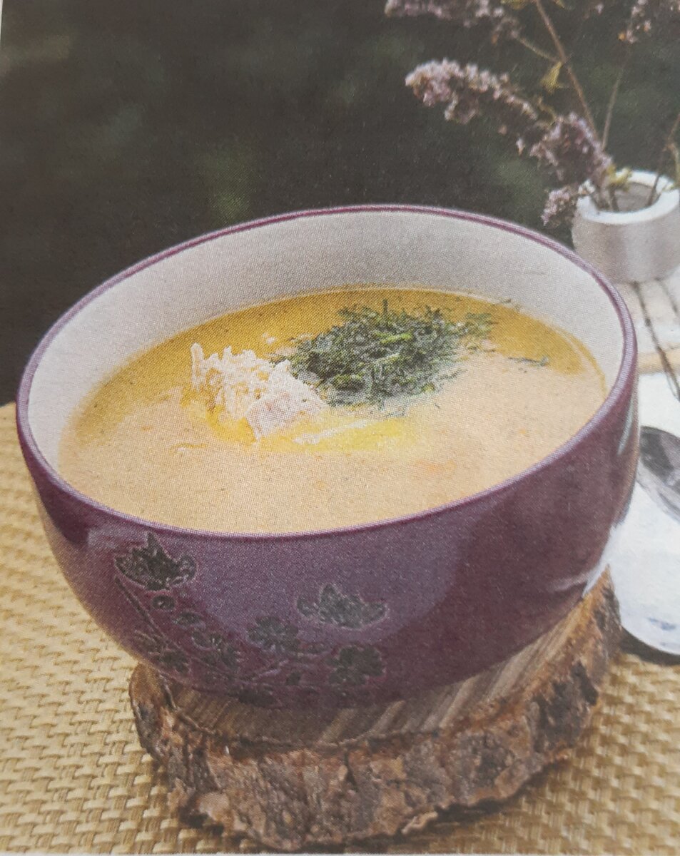 Способ приготовления: 2.Овощи вымыть, очистить и нарезать произвольными кусочками. Зелень вымыть, обсушить и порубить. 3. В кастрюле с толстым дном разогреть растительное масло и обжарить на нём овощи до легкого золотистого цвета. 4. Довести куриный бульон до кипения, залить горячим бульоном тушёные овощи так, чтобы он их едва прикрывал. Тушить под крышкой, на медленном огне 10 минут до готовности овощей. 5. Готовые овощи пюрировать с помощью блендера. Развести небольшим количеством бульона. 6. Разлить суп и уже в тарелку добавить кусочек курицы сливочного масла и рубленную зелень. Приятного аппетита!