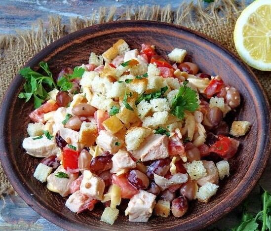 Мой муж очень любит, чтобы блюдо было сытным, с мясом давало много сил и энергии. Однажды я ему приготовила свой любимый салат с курицей, красной фасолью и сухариками. После чего этот салат стал нашей семейной фишкой и визитной карточной. И так приступим к приготовлению. Для салата нам понадобится: На сухарики: Приготовление: 1. Я начинаю с приготовления куриной грудки, ее промыть, поставить вариться в подсоленную воду до приготовления. 2. Пока варится курица, я занимаюсь приготовлением сухариков. Желательно сухарики готовить самостоятельно, мы с мужем пробовали добавлять покупные сухарики, но вкус салата получался совершенно другим и сильно отличался от привычного. Нарезаем белый хлеб не большими кубиками. К нарезанному хлебы добавляем не много соли, специй или пряных трав. Я чаще всего использую базилик, можно также добавить по вкусу. Далее выдавливаем не много чеснока, добавляем не много растительного масла и все тщательно перемешиваем. Очень важно чтобы масло и специи равномерн