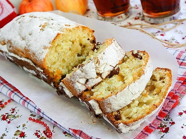 Добавить в тесто измельченное яблоко и изюм, тщательно перемешать. В тесто добавляется нарезанное яблоко и изюм
