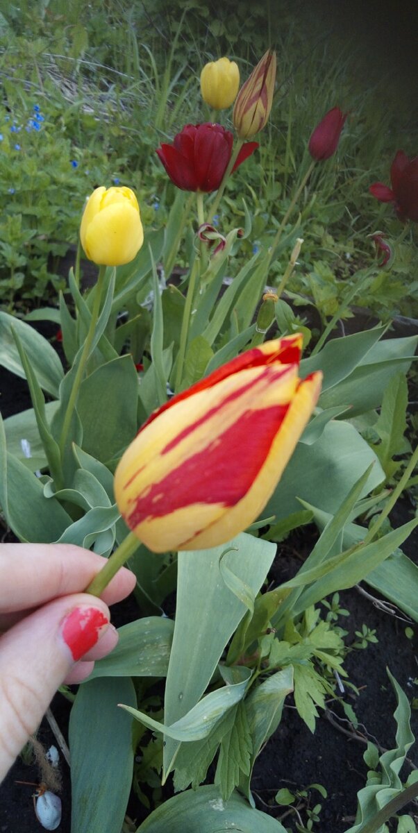 Всем здоровья! Всем привет! У меня есть большая грядка с тюльпанами. В прошлом году мне их дала моя тётя. Целый пакет луковиц. Сказала, что там разные. Я посеяла их рядами целую грядку с планом разобраться потом. В этом мае они прекрасно взошли и многие зацвели. Цветов было много разных. Я насчитала сортов 7. Ну точнее не сортов, а цветов, так как сорта не известны. Были даже два махровых вида: красные и цветные. Сегодня в интернете мне попалась информация про пестролепестность - это болезнь тюльпанов, при которой они изменяют окрас и болеют. В дальнейшем растение погибает и при жизни заражает другие тюльпаны.Изучив свои тюльпаны и поняла, что у меня половина растений не нормальные. На переднем плане больное растение. Сзади тоже видны такие же среди здоровых. Некоторые из них были ростом сантиметров 15 и корявые, цветочки полосатые. Я сразу выкопала все больные. Остались только чисто желтые и красные нескольких видов.