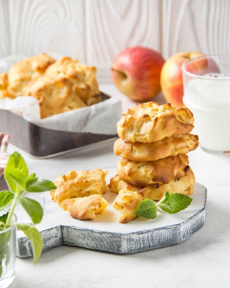 Ингредиенты: Крупное яблоко — 1 шт. Яйцо — 1 шт. Сахар — 60 г Сливочное масло — 60 г Йогурт или сметана — 3 ст. л. Пшеничная мука — 100 г Рисовая мука (можно только пшеничную) — 60 г Разрыхлитель — 1 ч. л. Корица — по вкусу Приготовление: ⠀ 1. В миске смешать яйцо, сахар, масло комнатной температуры. Растереть в однородную массу. 2. Два вида муки просеять и соединить с разрыхлителем. Постепенно ввести в яично-масляную смесь муку и йогурт (сметану). 3. Яблоки очистить от кожуры (можно оставить) и нарезать небольшим кубиком. Добавить яблоки в тесто и хорошо размешать. 4. На противень застеленный пекарской бумагой, выложить тесто с помощью ложки. Оставляя побольше места вокруг, так как печенье немного растекается и увеличивается в размере.