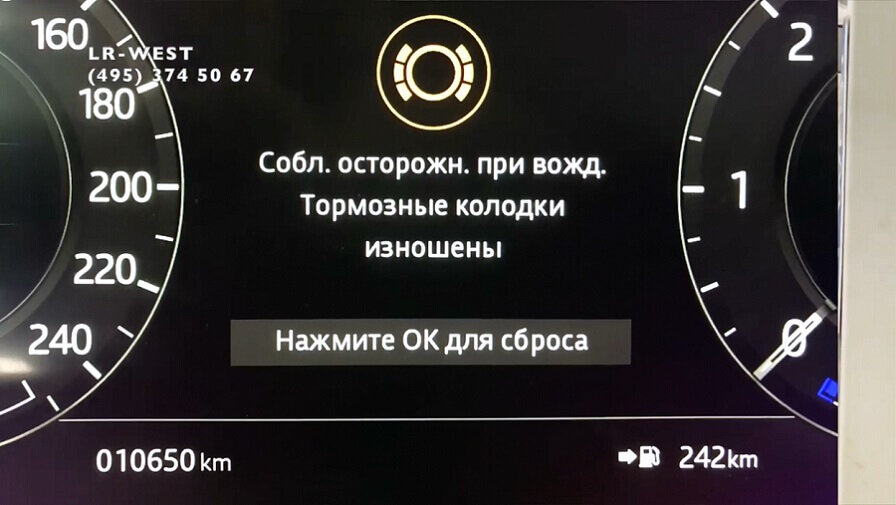На новом Range Rover Sport 2020 модельного года, через 3,5 месяца эксплуатации и пробеге 10 000 км, загорелся индикатор износа передних тормозных колодок.