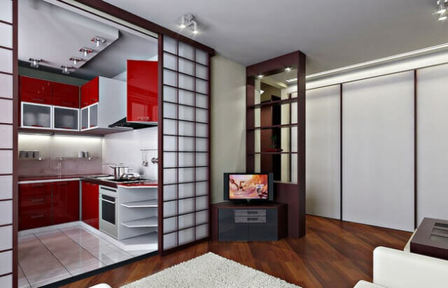 - Если хозяева квартиры переживают, что в какой-то момент им может надоесть совмещенная с залом кухня, можно установить специальную собирающуюся перегородку, которую при желании можно развернуть, или только частично раскрыть.