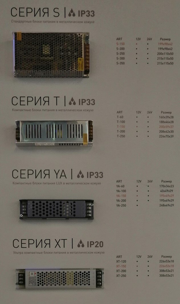 В этой статье поговорим как правильно подобрать и рассчитать блоки питания для светодиодной ленты. Какие параметры нужно учитывать при выборе блока питания,это мощность ленты она измеряется в ваттах и напряжение оно измеряется в вольтах,в основном ленты как я уже и писал раньше бывают от 4.8 ватт до 60 ватт с напряжением проще это 12 либо 24 вольта.Принцип расчета очень прост Вам нужно умножить мощность Вашей ленты на ее длину,так же как рекомендуют производители прибавить не менее 20% запаса,но лучше все таки 30%. К примеру возьмем ленту 17 ватт,допустим у нас ее у нас 20 метров.Соответственно получается следующее 17 х 10 + 30%=221 ватт, к сожалению блоков питания с такой мощностью нет,200 ваттного будет мало а вот 250 ваттный подойдет и запас будет еще больше,соответственно блок питания будет меньше нагреваться и проработает дольше.Так же очень важно что бы лента по напряжению совпадала с блоком питания в нашем случаи это 24 вольта. Так же существуют блоки питания для влажных помещен
