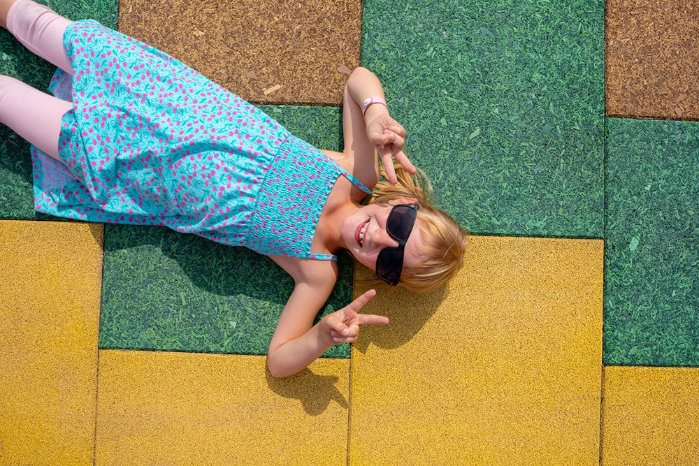 - Резиновая плитка или наливное бесшовное покрытие из резиновой крошки. Этот вариант является самым безопасным: ни плитка, ни покрытие не скользят даже в сырую погоду, и смягчают силу удара при падении. Они не требуют замены, легко чистятся, имеют различную колористическую окраску, позволяющую выполнить дизайн площадки в любой цветовой гамме.