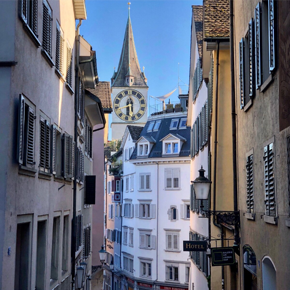 Вот мы и добрались до церкви Святого Петра, которая расположилась в более спокойном спальном месте. В отличии от Фраумюнстер, внутрь удалось попасть. Интерьер поразил аккуратной строгостью и бюджетностью, что нормально для практичных Швейцарцев. На площади возле церкви много интересных кафешек, в которые рекомендую заглянуть, чтобы подкрепиться чашечкой кофе и поймать атмосферу.