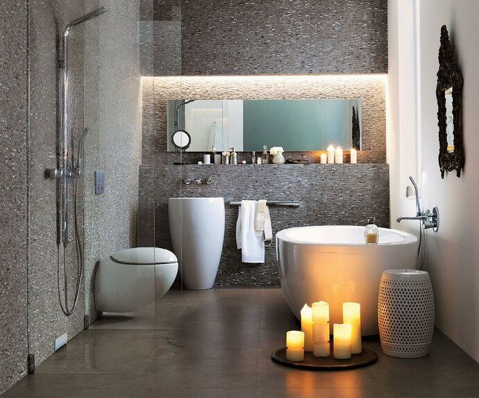 Вы можете купить готовую душевую кабину с поддоном, но вы также можете выделить место в ванной комнате для душа с дренажем в полу или в стене. Эффект действительно интригующий.