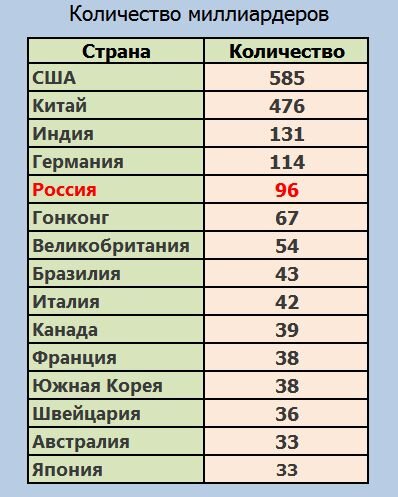 По итогам 2019 года Россия прочно занимает 5-е место в мире! Порадуемся за страну! Немного смущает тот факт, что это рейтинг стран по количеству долларовых миллиардеров... Количество миллиардеров по странам мира: Как видим, несмотря на все санкции, которыми пугают население, миллиардерам России удаётся сохранить своей состояние и находиться в пятёрке стран лидеров. Ещё "лучше" обстоит дело с рейтингом городов мира по количеству миллиардеров: О’key, по олигархам Россия в лидерах. Москва даже в тройке! А как обстоят дела со средним (по российским меркам - богатым) классом? Долларовые миллионеры по странам мира - 39,7% (18,614,000) всех долларовых миллионеров мира проживают в США, что делает их абсолютным лидером. Также 9,5% живут в Китае, 6,5% в Японии, 5,2% в Великобритании, 4,6% в Германии и 4,4% во Франции. В России же проживает только 0,5% (246,000). По населению мы, примерно, как Япония. И у нас в 3 раза больше миллиардеров, чем в Японии, но при этом в 12 раз меньше миллионеров! О