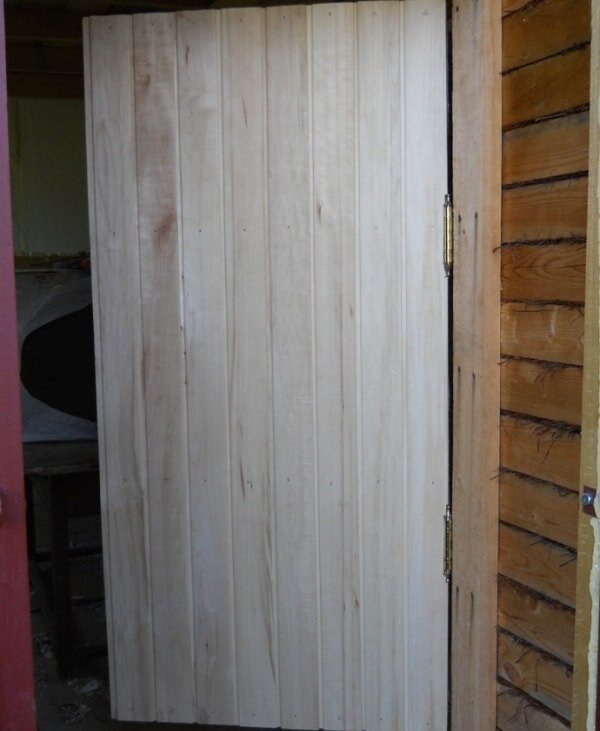 После проведения света я переключился на банную дверь. Хотел сначала заказать ее, но подсчитал цены, и решил, что сделаю самостоятельно. Навыки плотника у меня отсутствуют, поэтому приступал к работе на свой страх и риск. Дверь обшил осиновой вагонкой, утеплил пенопластом и поставил деревянную ручку.