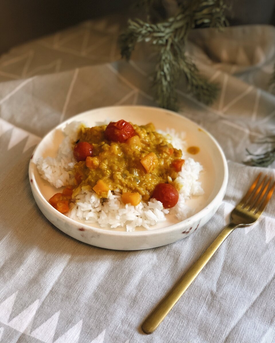 Сытное, ароматное и достаточно острое блюдо индийской кухни. Основа - это овощи, бобы и специи, подается с рисом Что же понадобиться? красная чечевица морковь красный лук тыква (опционально) чеснок помидоры черри (опционально) специи кокосовое молоко Начнем! 1. вымыть и нарезать овощи 2. обжарить на небольшом количестве масла лук, морковь и тыкву. зубчики чеснока выдавить через чеснокодавку - так они распределятся в блюде лучше 3. добавить специи. самая важная специя - это карри (2 чайной ложки), это ароматная смесь очень пряных и довольно острых приправ. также имбирь (половина чайной ложки) и куркума (1 чайная ложка). также не забудьте посолить 4. добавьте горячую воду и промытую красную чечевицу 5. варить до готовности чечевицы. попробуйте на специи 6. добавить кокосовое молоко (~200мл) и черри. уварить до кремовой текстуры ~10минут 7. подавать с рисом. он смягчит остроту карри Enjoy your meal!