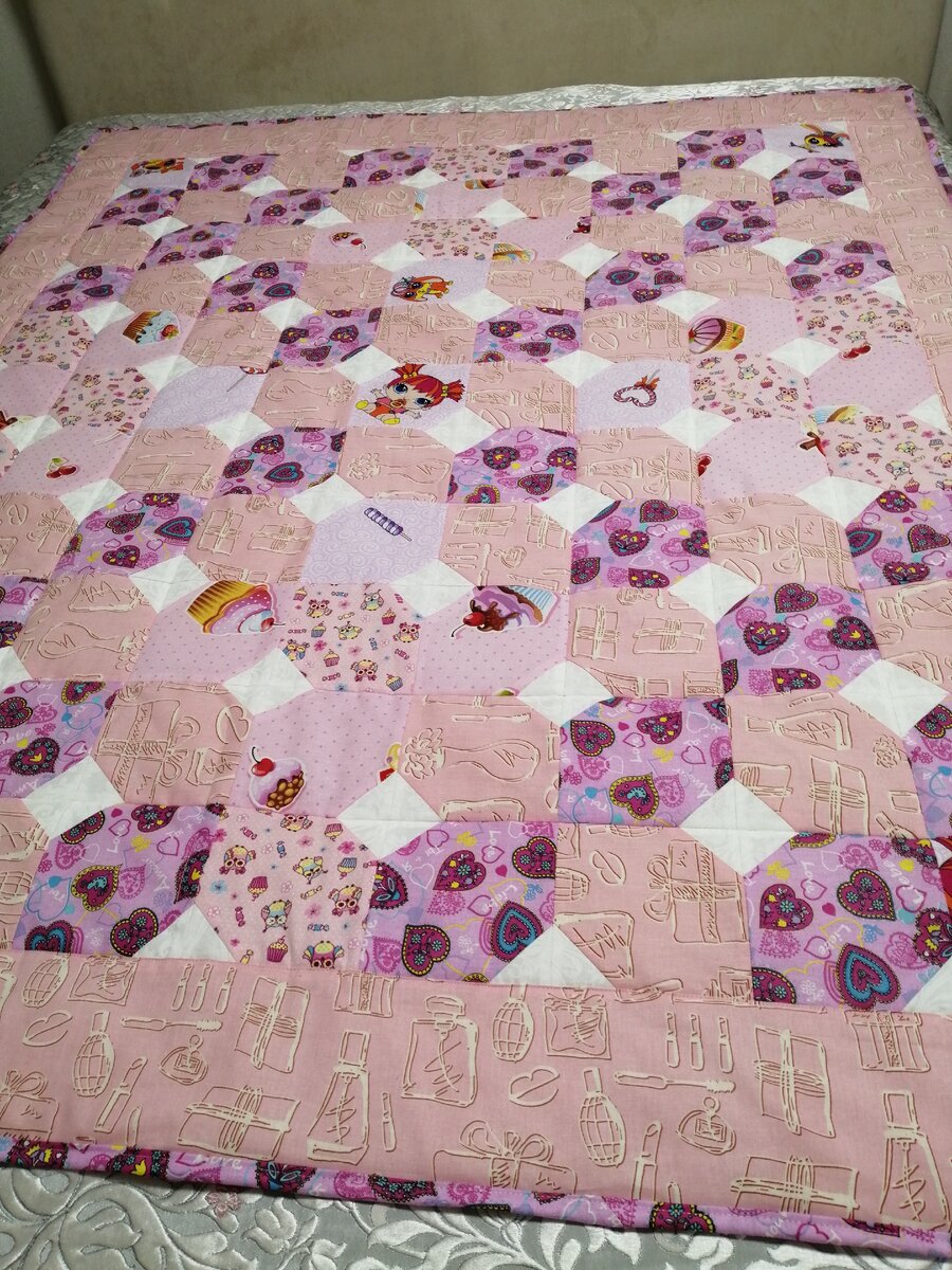 Мой главный критик – это как не странно супруг, он видит сразу все мои недоработки и оплошности, очень скептично относится к любому моему начинанию и только после завершения, даёт свою рецензию. И знаете, что он сказал по готовому этому одеялу? – Хочу такое, только больше и не в девчачьих тонах! Придётся ублажить мужа и сшить ему подобное одеяло, хотя сделать это будет труднее по двум причинам: первая – необходимо подобрать ткани соответствующей расцветки, второе – не люблю делать однотипные вещи и каждая новая сшитая вещь совершенно уникальна и неповторима.