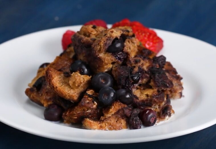 Французский тост с черникой. Мой любимый завтрак. Очень вкусно и полезно. Дает энергию на весь день. Ингредиенты на восемь порций: Приготовление: 1. Нарезать хлеб на четверти и выложить на дно смазанной жиром мультиварки. 2. Сверху положить чернику. 3. В большой миске или мерной чашке смешайте яйца, кленовый сироп, кокосовое масло, экстракт ванили, корицу, цедру лимона и молоко. 4. Вылейте смесь на хлеб и перемешайте. 5. Готовить на слабом режиме 7-8 часов. 6. Осторожно снять крышку и подавать с кленовым сиропом и сахарной пудрой. 7. Наслаждайтесь! Понравился рецепт? Поставь лайк, если не сложно. И подписывайся за новой порцией рецептов.