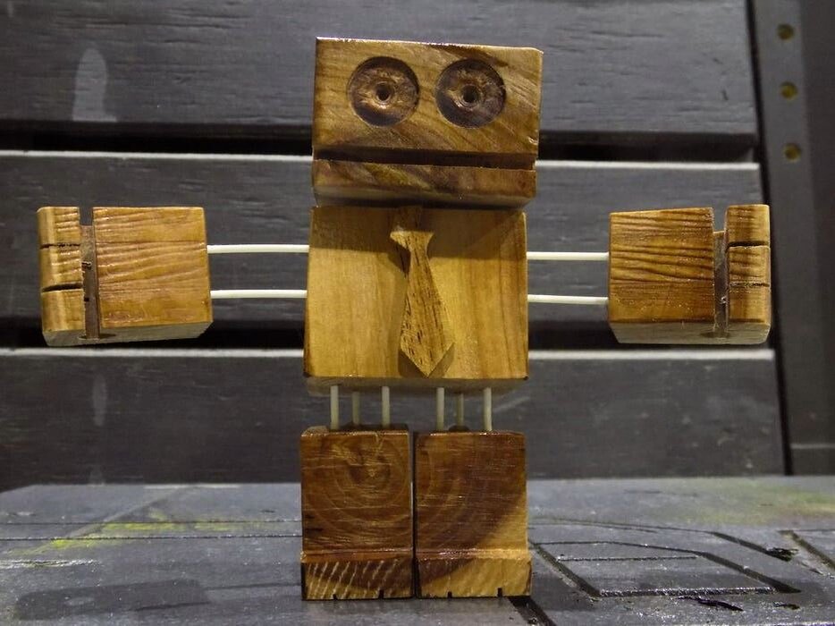 Вам одиноко, не с кем разделить радость творчества и тишину деревенского вечера? А сделайте себе друга, сами, из чего найдем, из того и слепим. И будет кому подержать букетик, пока вы чаевничаете. Возможно придержит свечу для вашего настроения. Или станет подставкой для книги или держателем ваших любимых ложки и вилки :) Шаг 1. Подбираем материал для друга А лепить будем конечно же из обрезков, да отходов, ничего для нового друга не жалко. В ход пойдет любая древесина, даже с дефектами, может с ними даже и колоритней получится. Шаг 2. Голова и галстук Наш новый друг с легким налетом интеллигентности, поэтому галстук должен быть. Глаза высверливаем фрезой или пером, рот пропилили на циркулярке. Шаг 3. Руки да ноги Особых требований к ногам и рукам нет, можете модифицировать их на свой вкус. Шаг 4. Собираем в кучу Провод выполняющий функции соединителя был не очень толстый, поэтому пришлось использовать по два куска для рук и по три для ног, что бы робот не "раскисал" :) Шаг 5. Финишные