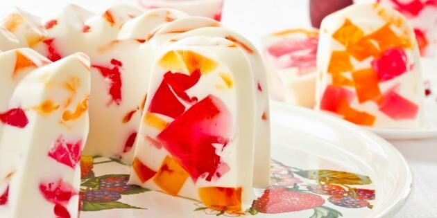 Красивый сливочный торт для любителей мармелада. Ингредиенты: Приготовление Приготовьте желе: каждые 50 г порошка залейте 100 мл кипятка, размешайте, остудите и уберите в холодильник до полного застывания. Если у вас нет готового цветного желе, окрасьте с помощью фруктовых соков или пищевых красителей обычный желатин. Когда желе застынет, его нужно будет произвольно нарезать. Куски должны быть довольно крупные и неровные, будто битое стекло. Очистите и порежьте крупными кубиками киви. Охлаждённую сметану взбейте с сахаром и ванилином. Разведите в воде желатин. Когда он набухнет, растопите его (но не кипятите). Тонкой струйкой, продолжая взбивать, введите его в сметану. Сметанную массу соедините с желе и киви, тщательно перемешайте и выложите в силиконовую форму. Разровняйте, чтобы куски желе не выглядывали. Уберите в холодильник до полного застывания.