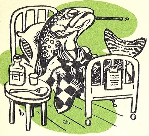 Рыба, вне зависимости от ее вида является живым существом. А значит, ей также присущи различные болезни. Каждый рыбак, отправляясь на промысел должен знать тот минимум, который поможет сохранить свое здоровье и здоровье окружающей среды. Как распознать, что рыба больна, чем больна и насколько опасна обо всем этом будет дальше. Нужно уметь вовремя увидеть больную рыбу Часто рыбаки наблюдают изменения внешнего вида у пойманной рыбы, либо же ее необычное поведение. Проанализировав все это вместе можно сделать вывод, что рыба болеет. Чернильнопятнистая болезнь Ее еще называют постодиплостомаз. Увидев черные точки по телу рыбы можно не сомневаться, она заражена именно этой болезнью. Плавники, жабры, чешуя – точки могут быть где угодно. Чаще всего этим заболеванием болеют такие виды рыб как толстолобик, карп, вобла, плотва, окунь и другие виды речной рыбы. Что представляет собой заболевание? Именно в черной точке расположена капсула, в которой живет личинка гельминта. Главным хозяином эт