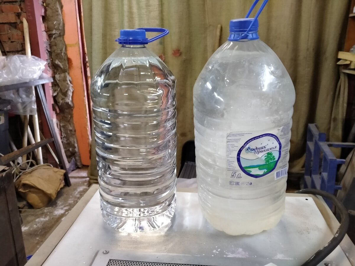 Зашёл зимой в цех -8* , где стоят две бутылки с водой. Одна из под крана профильтрованная, а другая покупная из бочки. Одна полностью промерзла и превратилась в лёд, а другая нормальная, жидкая.