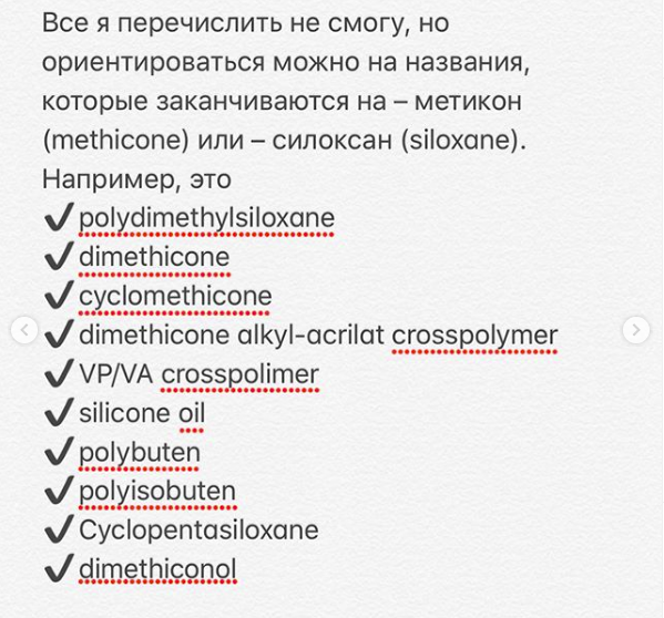 Сколько раз вы слышали рассказы про жуткие силиконы в косметике? Что они очень вредные и ни в коем случае нельзя их мазать себе никуда. Все это, конечно, один большой миф! Все силиконы разные! Начнём с того, что силиконов очень и очень много, и все они разные! Напомню, что не нужно верить всему, что пишут в интернете, в 90% случаев пишется это копирайтерами, а не специалистами, и часто на заказ в противовес чему-то другому. Например, декоративная косметика без силиконов получается откровенно плохо. Тональные крема натуральных брендов, мягко говоря, неудачные. В уходе их тоже используют и довольно часто, хотя лично я в рецептурах их не использую и уход такой стараюсь не покупать. Не потому что вредно, а потому что бесполезно, место занимают, а пользы особой не приносят, лучше на их место актив какой-то впихнуть. И несколько кратких фактов: ✔ По своей природе силиконы инертны, поэтому не вызывают аллергии (чаще всего, не забываем, что есть индивидуальные реакции). ✔ Они прекрасно удержив