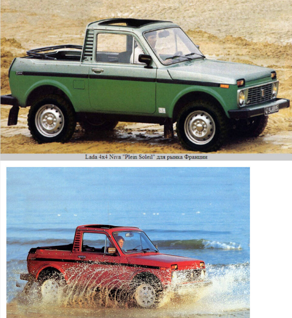 Пожалуй, пальма первенства в создании кабриолета на базе «Нивы» принадлежит французской компании Poch — эта компания занималась импортом ВАЗов во Францию и у нас в стране известна в основном благодаря победам ее гонщиков на наших «Нивах» в гонках Париж-Дакар. Компания Poch благодаря энергии ее основателя Жан Жака Пока, вообще была одним из самых активных импортеров советских моделей. Именно она активно продвигала наши машины в европе. А еще фирма Poch первой во Франции придумала демонстрировать автомобили в супермаркетах. И были это наши «Лады». Переделка стандартных «Нив» в кабриолеты осуществлялась французским кузовным ателье Lebranchu, а уже продажи осуществлялись через сбытовую сеть Poch. Кабриолеты, получившие название Plein Soleil (под солнцем), начали выпускаться в начале 80-ых годов ХХ века и изготавливались по сравнительно простой технологии — просто отрезалась задняя часть крыши, а чтобы компенсировать ее отсутствие усиливались оставшиеся силовые элементы конструкции кузова. Поскольку отрезанная крыша снизила жёсткость кузова, которую надо было как-то компенсировать, для этого вдоль нижней кромки оконной линии задних пассажиров вваривались два швеллера, которые соединяли поперечной балкой сверху дугой, которая формирует каркас крыши. Так в 1982 году появилась первая открытая версия кабриолета Lada 4×4 Niva Plein Soleil от французов