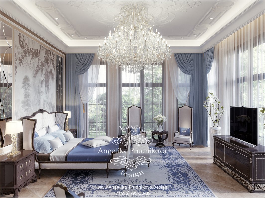 Дизайн-проект интерьера спальни в классическом стиле в элитном загородном доме