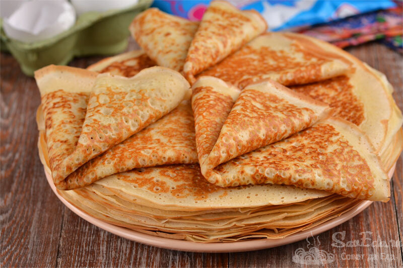 12. Красивые и очень вкусные блины на кефире подаём со сметаной, любимым вареньем или сгущёнкой. Их можно использовать для наполнения начинками или приготовления блинного торта.