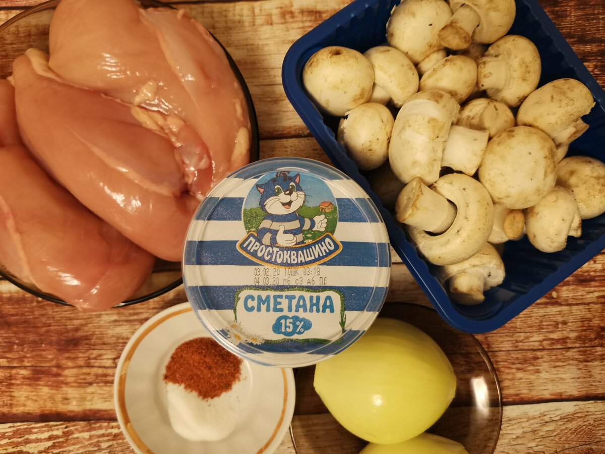 Нравятся нам незамысловатые, очень простые и быстрые в приготовлении блюда. Иногда конечно на нас нападает волна вдохновения и мы можем приготовить что-то такое, что и сами не ожидаем🙈. Но сегодня не тот день, поэтому мы приготовили наверное самое простое что могли придумать. Кура с грибами в сметанном соусе. Для приготовления нам понадобится: Берём противень и на дно выкладываем порещаный лук. Можно порезать кубиками как мы или полукольцами. Затем нарезаем куриное филе. Мы нарезали кубиками, вы делаете по своему усмотрению, это не принципиально. Выкладываем его на лук. Затем нарезаем грибы. Мы предварительно чистим их шляпки и моем. Выкладываем грибы на куриное филе. Теперь подготовим соус. Смешаем сметану, соль и специи. Добавим воду, воды мы льем "на глаз" зависит от того, сколько его нужно. В данном случае было примерно 200мл. Теперь перемешиваем соус и выливаем его в противень, поливая все блюдо. Теперь отправляем в духовку на 10-15 минут при 180 градусах. Когда отщелкнет,