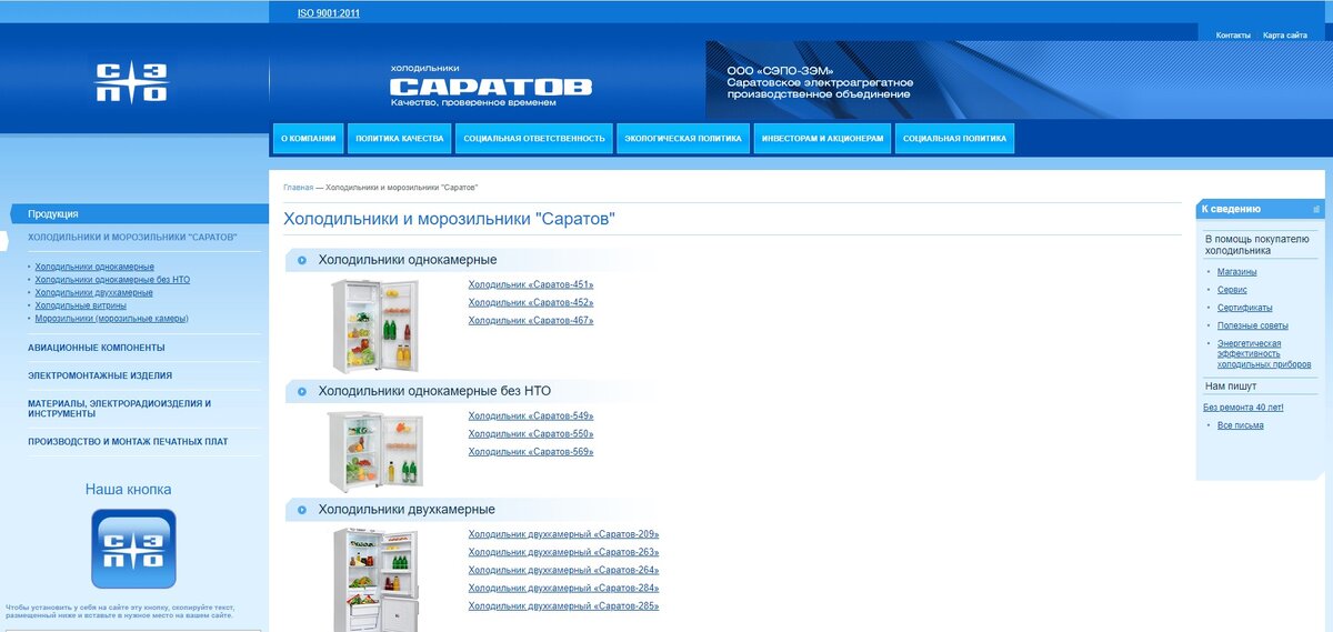 На сегодняшний день на официальном сайте ОАО «СЭПО» выставлена линейка холодильников и морозильников «Саратов» от однокамерных до холодильных витрин и морозильных камер. Рассказывается о сервисе, сертификатах на продукцию и магазинах, где «Саратов» можно купить. Надо сказать, что сеть дилеров разветвленная и обширная. Холодильники «Саратов» представлены более чем в 200 городах России от Москвы до Тюмени, от Каргополя до Армавира.