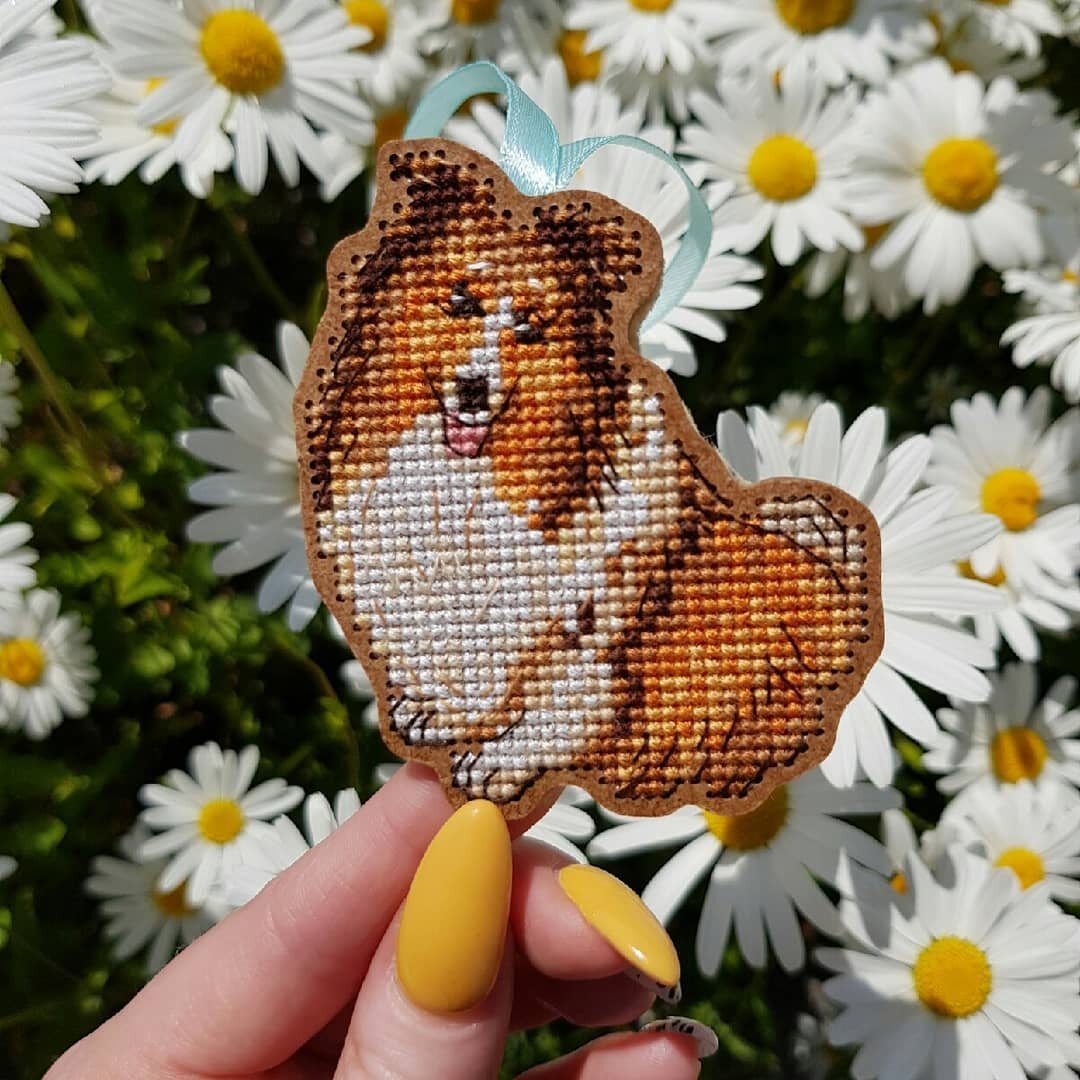 1. Первый финиш у меня случился летом. Это шелти от «Дивной вишни». Впервые вышивала на деревянной основе. По впечатлениям – сплошной позитив, деревяшку удобно держать в руках, через 2 недели я уже радостно фотографировала результат на фоне ромашек.